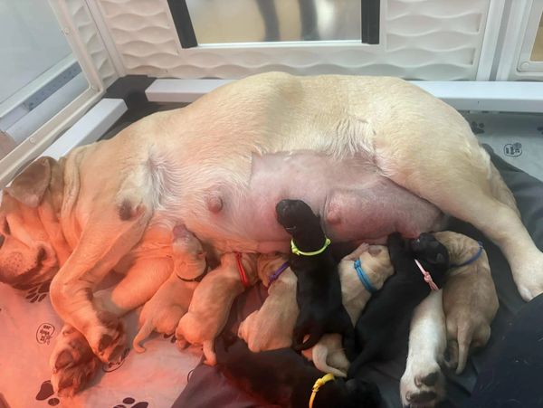 Notre douce Meraki a donné naissance à 8 précieux chiots Labrador Retriever anglais de race pure — 6 femelles et 2 mâles, tous issus de lignées de champions nord-américains et dotés de gènes dignes des concours canins. ✨